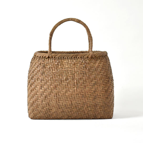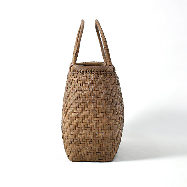 This large, rounded basket bag is woven from wild grape vines, which become softer and more lustrous with use, becoming more comfortable to wear. Its bulge in the middle provides excellent storage capacity, and its well-balanced form gives it a solid, stable feel.