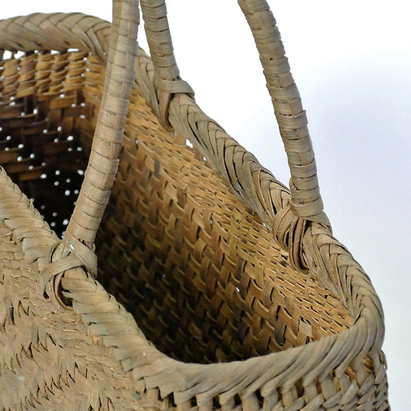 This box-shaped basket bag is made from wild grape vines, and the more you use it, the more lustrous and soft it becomes, becoming more comfortable with the wearer. Its convenient size makes it perfect for everyday use, and the design is accented by the lines (steps) added to the top and bottom of the ajiro weave using a technique called a tie-dye.